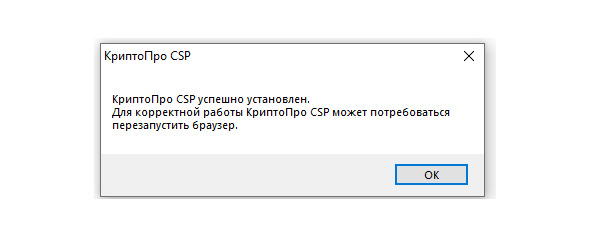 По завершении установки КриптоПро вам будет выдан диалог подтверждения, показывающий, что КриптоПро успешно установлен в систему.