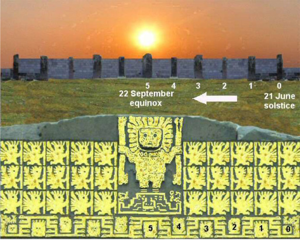 Во время строительства Каласасайя Тиуанако использован календарь на 20 месяцев, потому что он записан на Воротах Солнца и первоначально с 11 массивными каменными колоннами в западной стене (Календарной стене). Он также записан Сьесой де Леон как календарь на 10 и 10 месяцев. Периоды времени для работы были организованы в группы по девять дней, совместимые с делением на восемнадцать дней и 20 месяцев [272]. На Вратах Солнца на старом снимке, хорошо видны значки в трех рядах, образующие блок из трех рядов по пять с каждой стороны от центральной фигуры и одиннадцать меньших значков на фризе внизу. Затем конструкция повторяется, как будто ее следует продолжить на дополнительных стенах на стороне, которая больше не существует. Таким образом, в каждом ряду есть пять иконок, плюс еще три, дающие начальное впечатление о восьми.