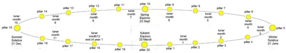 Когда Солнце достигло первого столба, оно прошло бы 1/20 солнечного года, что составляет 18,26 дня. К тому времени, когда он достигнет середины пути к следующему столбу, он снова должен был бы проехать вдвое меньше, что при добавлении к первой цифре означает, что прошло бы 27,39 дней – практически сидерический лунный месяц – каждые полтора столба добавили бы еще один сидерический месяц и продолжение процесса вернет нас к центральному столбу после того, как пройдет 13 и третий такой звездный лунный месяц (или деление), завершив солнечный год и сделав его двойным, солнечно-лунным календарем.