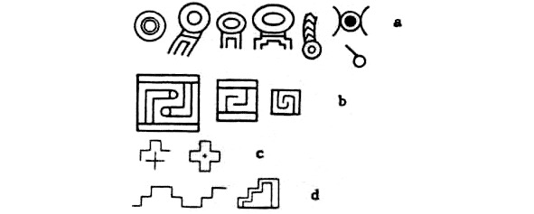 Изображениях Верховного Бога (Виракочи), а также его пернатых божеств или крылатых спутников на Вратах Солнца в Тиуакане состоят из множества определенных элементов, в виде геометрических фигур. Впервые это определил Артур Познанский, он выполнил серьезную работу по изучению этих элементов, встречающихся и на других памятниках [244]. Он классифицировал их в соответствии с изображенным объектом (животное, рыба, глаз, крыло, звезда и т.д.) или понятием (Земля, небо, движение и т.д.). Познанский первым выяснил, что круги и овалы всевозможных цветов и размеров служат для обозначения Солнца, Луны, планет, комет и других небесных тел (рис. 32а), что на барельефе часто встречается отображение связи Небо—Земля (рис. 32b) и что доминирующими символами являются крест и ступени (рис. 32с). В последнем элементе, лестнице, он усмотрел «фирменный знак» Тиуанако – его памятников и всей цивилизации, – откуда этот символ распространился по всей Америке. Он признал, что этот знак напоминает зиккураты Месопотамии, но поставил под сомнение возможность присутствия шумеров в Тиуанако [244]. Все эти особенности усиливали ощущение Познанского, что Врата Солнца являются частью большого комплекса в Тиуанако, который выполнял функцию обсерватории.