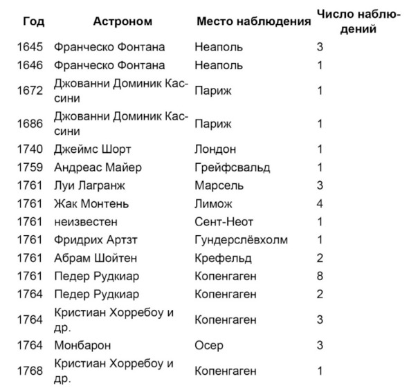 Таблица 1. Сводная таблица наблюдений спутника Венеры [283]
