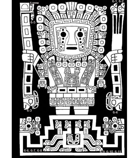 В календаре Тиуанако нет ни одной лишней детали и постоянно проявляется многофункциональность. Так, рот Верховного Бога, во-первых, придает законченность всему изображению. Как можно обойтись без рта? Во-вторых, этот рот нарисован в виде длинной полоски между двумя головами ягуаров с кружочками на носу, что свидетельствует о прошедшей ранней катастрофе между Первой и Второй Эпохами. С левой и правой сторонами от глаза (Земли), в подтверждении этому, показано в виде стрелки, приложенной к планете. Эта стрелка направлена вниз, следовательно, в ранней катастрофе один из спутников погиб. Нос также является элементом двойственности: это просто нос и одновременно воронка, куда ранее попала Земля и её спутники. Ну и главное, здесь показаны три черные слезинки, олицетворяющие три спутника Земли. Они показаны в виде слезинок именно потому, что с ними произошли изменения, вплоть до полного разрушения двух нижних из них.