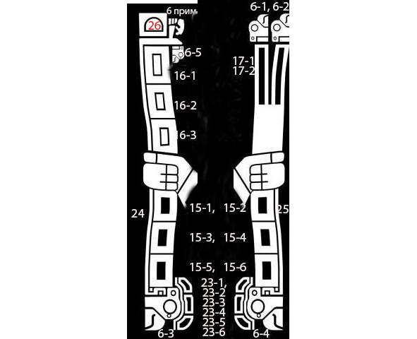 До катастрофы считаются только белые, не зачерненные прямоугольники в жезле. Они объединены в единую систему белыми направляющими линиями по краю, под номером 24 и 25 на рис. 61.