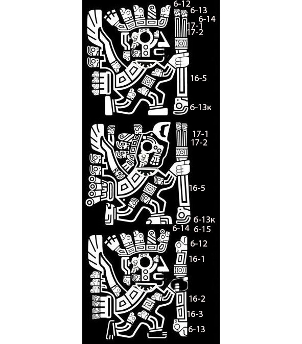 Итак, сравниваем, на изображении пернатого божества в нижнем ряду показан символ меандр, отражающий планету Землю (позиция 46 на рис. 54 или рис. 58). В том же месте на изображении пернатого божества в среднем и верхнем рядах показаны знаки Венеры 8—1 (рис. 54). Чем же отличается нижний ряд пернатых божеств от среднего и верхнего? Главное отличие одно: на нижнем ряду показаны события до катастрофы. Следовательно, создатели календаря хотели показать нам, потомкам, что в Солнечной системе после катастрофы место планеты Земля заняла Венера. Получается, что до катастрофы положение Земли было иным, период орбиты Земля вокруг Солнца до катастрофы был существенно меньше. Картинка символа меандра – рис. 58 – только одна и тогда 1 х 200 = 200 дней. На картине Верховного Бога есть сдвоенные единичные блоки 55—1 и 55—2 (см рис 17а и рис. 78б). Эти сдвоенные меандры с ягуарами соединены через направляющие с пальцами рук. Пальцев по четыре, следовательно сумма меандров – 2 х 2 х 4 = 16, а общая сумма для времени орбиты – 200 +16 = 216 дней. Как видим, несколько эпох назад, а на картинках с пернатыми божествами этих эпох указано пять: четыре выступа – позиция 39 на рис. 17 б.
