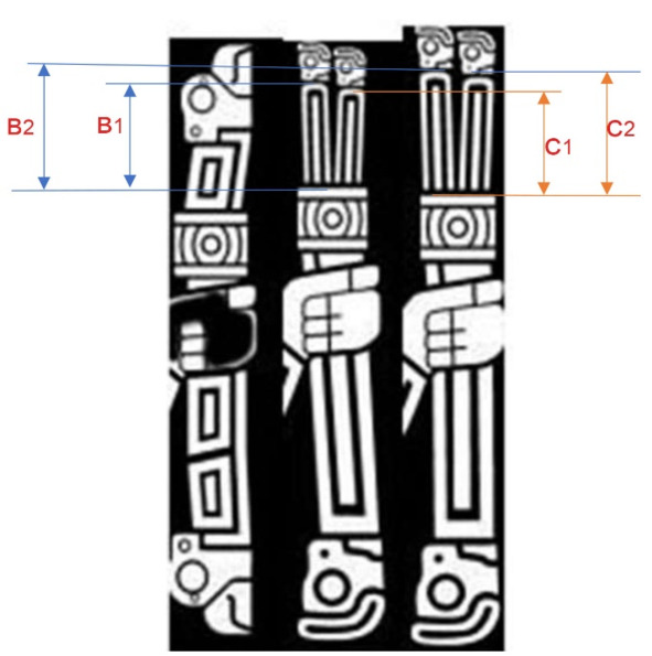 Расчет времени синодического периода Марса проводится по количеству прямоугольников в жезле. Логика тут простая: все, что связано с жезлом, связано с войной и Марсом, являющимся Богом войны. Кондоры, изображённый на концах жезла, являются признаём смерти и с признаком войны. В жезле есть фигуры, по которым можно определить параметры спутников Марса – Фобоса и Деймоса. Таким образом, основная часть фигур в жезле связана с Марсом и его спутниками.