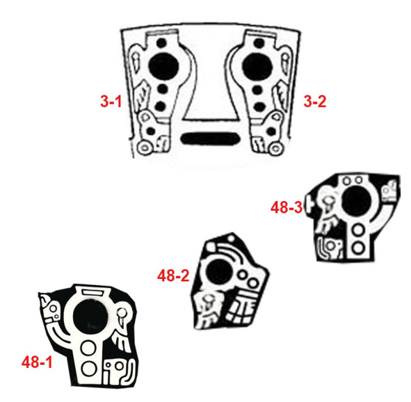 Теперь обратимся к изображению пернатых божеств – позиции 48—1, 48—2, и 48—3 на том же рис. 64. Позиция 48—1 соответствует пернатому божеству нижнего ряда, до начала последней катастрофы. Три элемента этого изображения доводят до нашего сведения, что другая, ранняя катастрофа уже произошла, обоснование – разбитая морда ягуара. Остатки оперения – свидетельство об участии Сатурна в прошедшей катастрофе, опять же, прорисовка кружочка справа с линией вниз, похожей на стрелку, это нам в помощь дана информация о том, что ранний спутник Земли (который в эпосе на Руси называется Лелей), разрушен. С левой стороны нарисован кондор, он еще целый, но является предвестником следующей катастрофы.