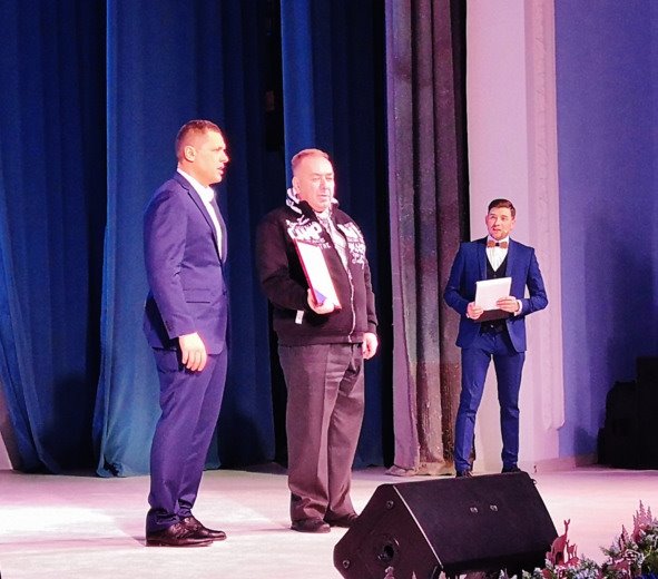 Глава Дмитровского городского округа И.И. Поночевный от имени Губернатора Московской области А. Ю. Воробьёва вручает Владимиру Броудо диплом Победителя Премии "Наше Подмосковье-2019" – пятый год подряд! Декабрь, 2019 г., Дмиров, ДК "Содружество"