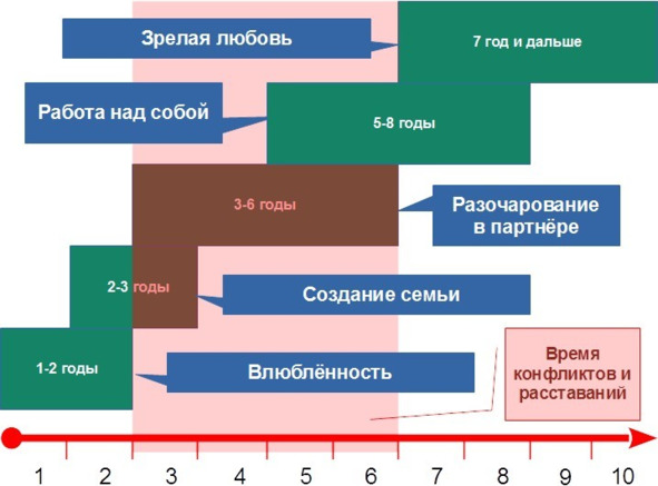 Первые два года отношений – всегда идиллия. Но как только проходит влюблённость, тут же наступает самое сложное время, – время конфликтов и разочарований. Для многих это время (с 3 по 6 годы отношений) заканчивается расставанием, хотя на самом деле это время даётся для того, чтобы переосмыслить свои ценности и начать работать над собой.
