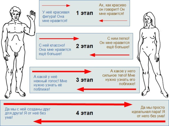 При этом, сближение мужчины и женщины выстраивается в разном порядке и с разной интенсивностью. Мужчину сначала сильно привлекает красивое женское тело, потом из этого рождается эмоциональная симпатия к женщине, а потом мужчине становится интересно разговаривать с женщиной. Женщину наоборот, сначала тянет поговорить с мужчиной и её первоначально привлекает сильный мужской интеллект, потом из этого рождается эмоциональная симпатия к мужчине и только после этого женщина привлекается телом мужчины.