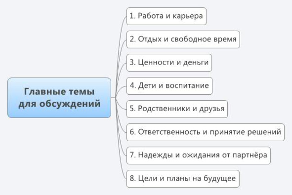 Перед тем, как мужчине и женщине создать семью и взять друг за друга ответственность, нужно выяснить, что им сулит совместная жизнь: счастливое будущее или бесконечные ссоры. Для этого существует целый ряд фундаментальных вопросов, которые желательно обсудить как можно раньше. И мужчине и женщине очень полезно вместе пройтись по всем пунктам, фиксируя свои ответы в специальных тетрадочках (мужчине – в своей, женщине – в своей).