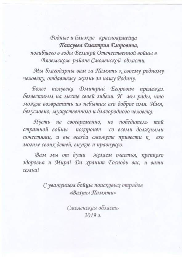 Я очень опечалился тому, что о ратной и достойной судьбе отца не узнала его супруга и моя мать, Папсуева Ольга Захарьевна, ушедшая в мир иной в 1991 году в возрасте 80 лет, прождавшая его всю оставшуюся жизнь.