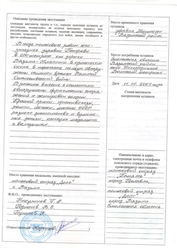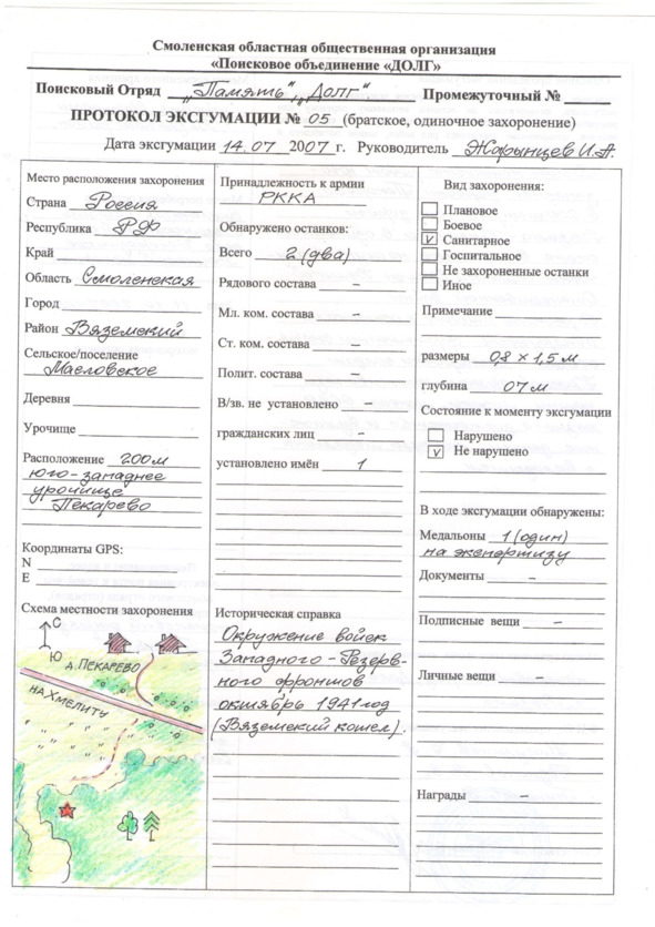 В ходе поисковых работ в районе деревни Пекарево Вяземского района Смоленской области 14 июля. 2007 года было обнаружено неизвестное воинское захоронение. Эксгумацию проводили поисковики Вяземского поискового отряда «Долг» Никулинов Г. А., Родионов В. С., Бунанев Я.