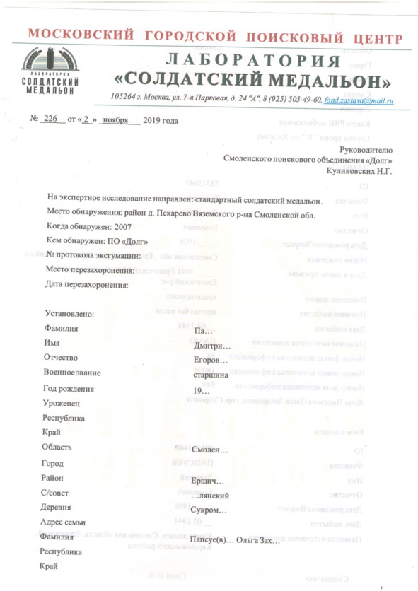Вместе с останками солдат был найден смертный медальон, фрагменты снаряжения и экипировки, противогазы, ремни, ложки, монеты и бумажные деньги СССР. По записи в медальоне было установлено имя погибшего – Папсуев Дмитрий Егорович. Запись в медальоне была настолько повреждена, что ПРОЧИТАТЬ ЕЁ НЕ УДАВАЛОСЬ 12 ЛЕТ. И только в 2019 году запись прочли в лаборатории «Солдатский медальон» в Москве.
