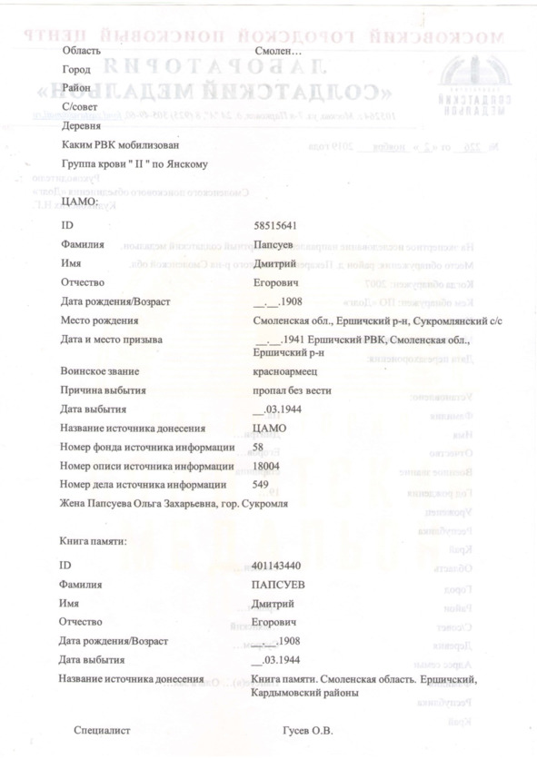 Семья получила извещение о том, что отец пропал без вести в марте 1944 года, и до ноября 2019 года я больше ничего о военной судьбе отца не знал.