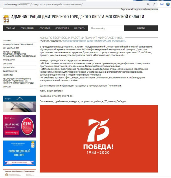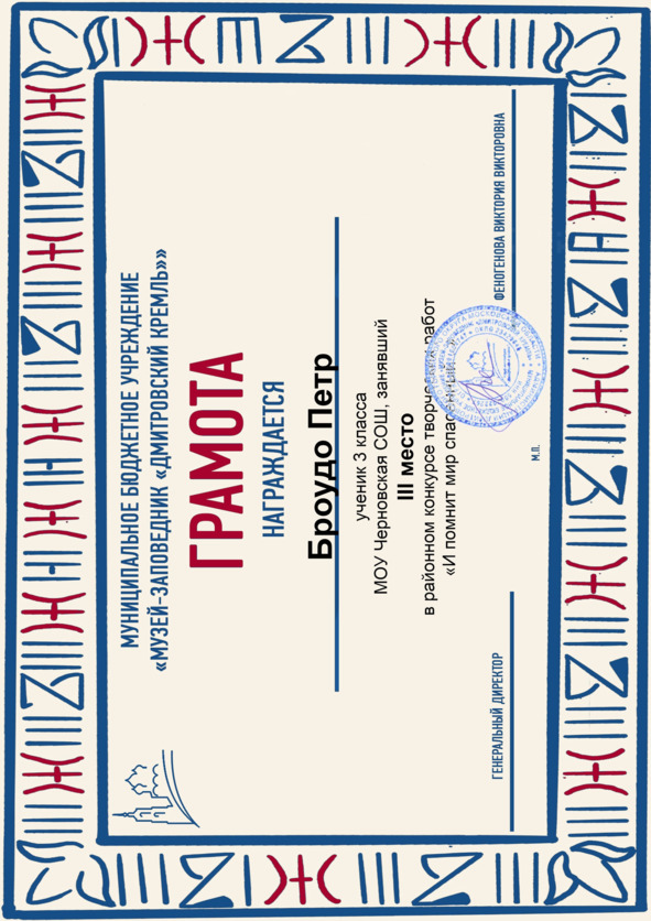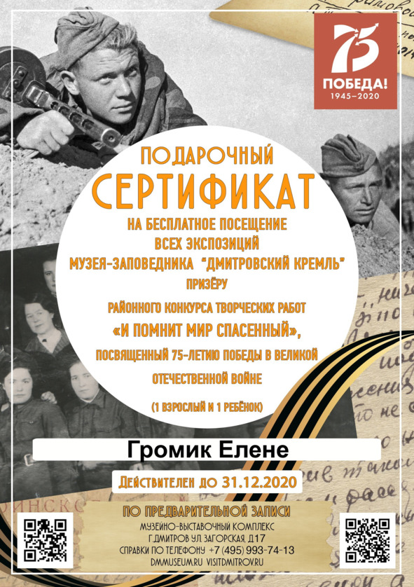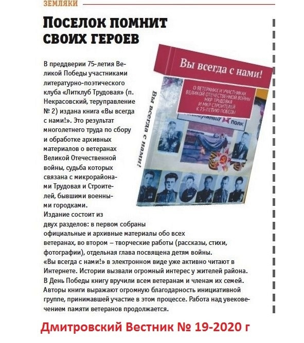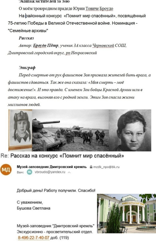 Поздравляем учащихся нашей Черновской школы, авторов Литклуба Трудовая – призёров районного конкурса творческих работ Дмитровского городского округа, посвященного 75-летию Победы в ВОВ «И помнит мир спасенный» Громик Елену (2 место) и Броудо Петра (3 место) в номинации «Литературные произведения. Семейные архивы».