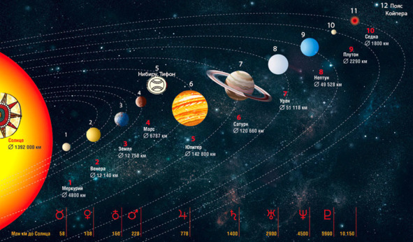 Рис. 3. Меркурий (1), Венера (2), Земля (3), Марс (4), Нибиру или Тифон с произвольной орбитой (5), Юпитер (6), Сатурн (7), Уран (8), Нептун (9), Плутон (10), Седна (11), Пояс Койпера (12), Облако Оорта (13).
