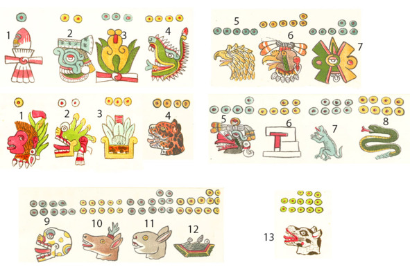На рисунках в кодексах майя и ацтеков эти эпохи могут отображаться поперечными линиями, или кружочками. В раскрытом автором календаре Тиуанако, эпохи отмечались двумя способами: кружочками или же областями на теле. Причем, области могли быть разной величины, в зависимости от того, какие произошли события. Кроме того, области, обозначающие эпохи могут быть закрашены разным цветом: белый – это цвет смерти, красный – это цвет борьбы или войны.