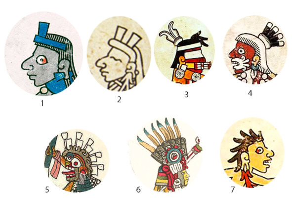 Теперь рассмотрим примеры более распространенные, когда тип планеты можно узнать в изображении по числу деталей на голове. В качестве деталей могут быть: перья, полоски, заостренные палочки, чубчики и др. На рис. 4 даны примеры по первому типу обозначений (красные цифры на рис. 2). Эти примеры взяты автором из разных кодексов.