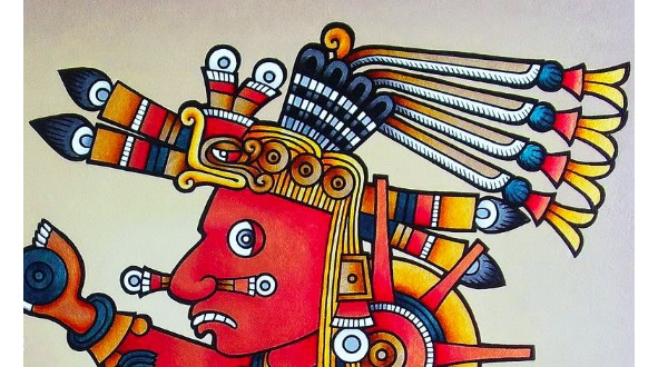 У этого Бога Солнца Тонатиу впереди на головном уборе две вертикальные полоски. Два – это признак Венеры, являющейся второй по удаленности от Солнца.