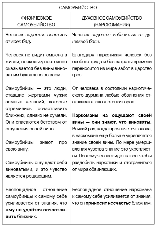 Меня очень часто спрашивают, как помочь наркоману. Ответ мой всегда один: помогите себе, тем самым поможете и ему. Кто помогает себе, тот понимает, что с наркоманией бороться нельзя. Если борьба с каким угодно отрицательным явлением ведёт к усилению данной негативности, то борьба с наркозависимостью конкретного человека означает его быструю смерть. Причём очень скоро умирает тот наркоман, борющиеся за которого люди доказывают свою любовь в глазах общественности тем, что выискивают виновных, которых необходимо сурово покарать. Запомните, если Вы действительно желаете помочь наркоману, то нельзя в его присутствии осуждать кого бы то ни было.