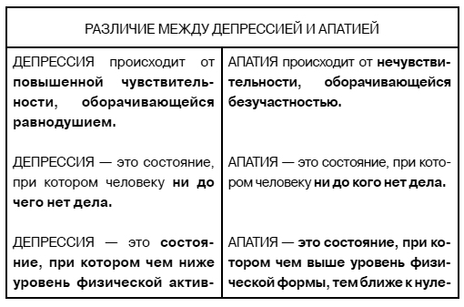 Апатия – это такое состояние, при котором человеку нет дела ни до кого. Кого он искренне любил, тот перестаёт для него существовать, не говоря уже о вечно им недовольных и осуждающих согражданах. Апатия делает человека глухим ко всему живому и в первую очередь к самому себе. Если он превратил себя в предмет или машину-автомат, то он и подавно не испытывает к себе никаких чувств. По сути дела, чем глубже апатия, тем тело менее подвержено болезням. Из-за утраты чувствительности человек становится невосприимчивым к травматической боли, чем удивляет окружающих, возводящих его в ранг стоических героев.