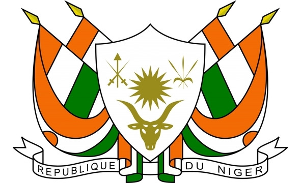 Щит покоится на перекрещенных древках четырех государственных флагов. На серебряной ленте, расположенной под щитом, начертано название страны: «РЕСПУБЛИКА НИГЕР».