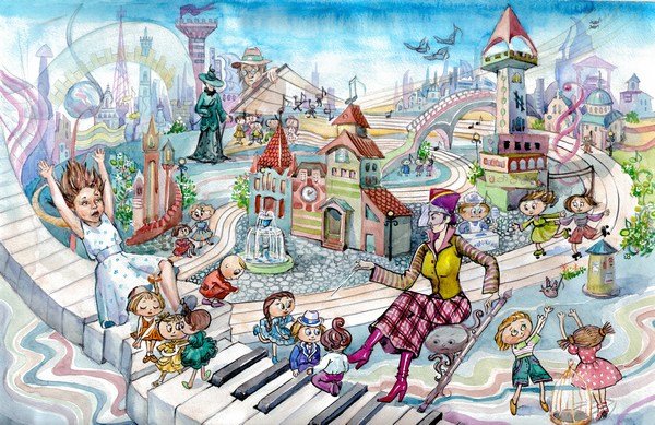 Слава осторожно три раза нажала самую крайнюю клавишу, словно постучала в музыкальную дверь, и тут же оказалась рядом с ноткой ФА в большом светлом зале, наполненном музыкой. Вокруг было много нот. Некоторые двигались, держась дружно за руки, другие шли по одному. Одни подскакивали и приседали, иные ступали плавно. Нотки были разноцветными в аккуратных костюмчиках или платьицах. И, казалось, что музыка, звучащая вокруг, тоже цветная.