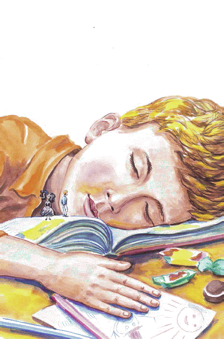 Баг, перескакивая с ноги на ногу, подлетел к раскрытой книге, на которой лежала голова вихрастого паренька. Под книгой раздалось шуршание. Баг нагнулся и увидел испуганную пылинку.