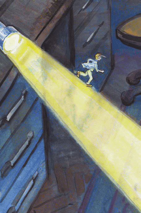 Баг с силой нажал на огромную резиновую кнопку. Яркий белый луч вспыхнул и ударил в противоположную стену. Баг наклонил фонарик, светящаяся дорожка упёрлась в пылесос. Быстро вскарабкавшись, Баг побежал по этой дорожке вниз и немедленно забрался внутрь пылесоса.