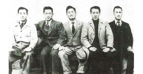 Лидеры первых кванов (слева-направо) Ро Бён Джик, неизвестный, Юн Бён Ин, Чон Сан Суп, Ли Вон Кук. Именно они оказали самое заметное влияние на процесс создания тхэквондо.