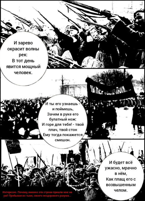 Вопрос: «Как товарищ Сталин повлиял на мою творческую жизнь, и на мои работы в частности?». Увы, но молодого человека с подобными интересами я предпочёл проигнорировать. Так уж получилось в моей нелёгкой жизни, но я ни при каких условиях, не хочу вспоминать то время. Те жуткие нападения упырей на пролетариев, а также их безумные, кровавые пиры в аристократических салонах вводят меня и по сей день в невыносимую дрожь. Товарищ Сталин, до сих пор влияет на меня и на моё творческое дело. Мы связаны с ним особым контрактом, который вынуждает всегда быть на стороже, в случае если вампиры опять, появятся на советской земле, и начнут массовый террор наших граждан. И хоть я продолжаю быть противником революционных репрессий, но я знаю лишь одно. Если бы ни жестокость Кобы, и Ульянова в своё время, мы бы наверное никогда не победили вампирский род на корню.