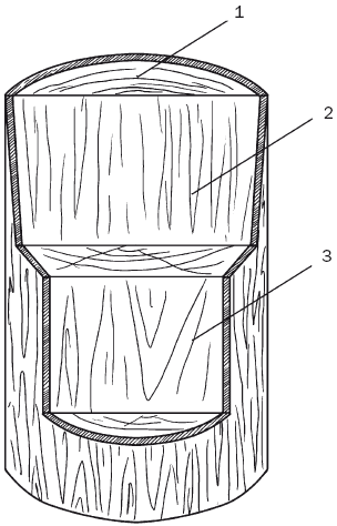 Рис. 1. Основные плоскости ствола дерева: 1 – торцевая; 2 – радиальная; 3 – тангенциальная