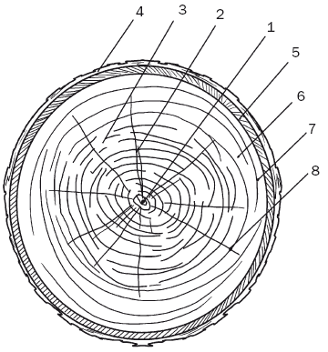 Рис. 2. Торцовый разрез ствола дерева: 1 – сердцевина; 2 – сердцевинные лучи; 3 – ядро; 4 – пробка; 5 – луб; 6 – заболонь; 7 – камбий; 8 – годичные кольца
