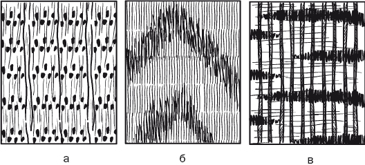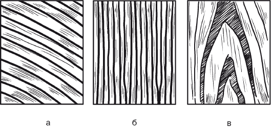 Рис. 3. Рисунок годичных колец на разрезах: а – торцовом; б – радиальном; в – тангенциальном