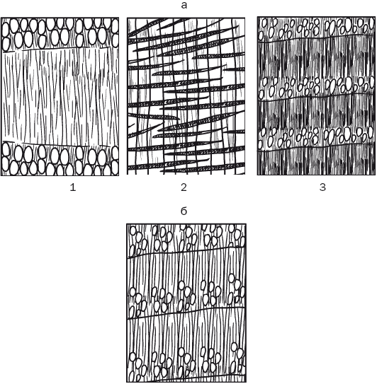 Рис. 5. Разновидности группирования сосудов: а – у кольцесосудистых пород: 1 – радиальная группировка; 2 – тангенциальная группировка; 3 – рассеянная группировка; б – у рассеянно-сосудистых пород