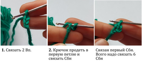 2. В первую петлю (это вторая петля от крючка) связать 6 столбиков без накида.