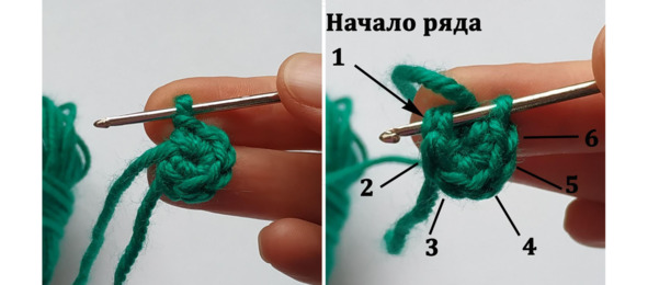 Вязание игрушек часто начинается с 6 столбиков без накида, связанных в кольцо амигуруми (или просто в кольцо).