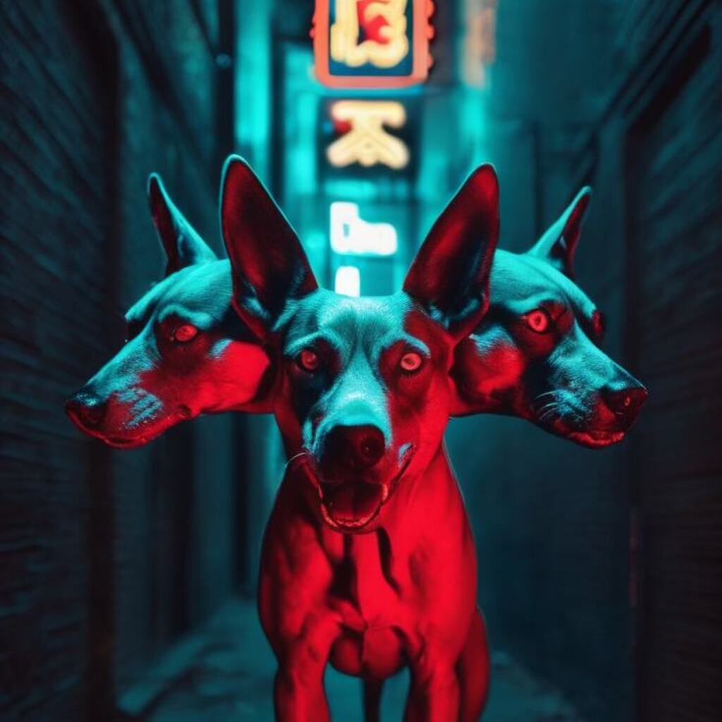 Пёс с тремя головами смотрит на неё с любопытством, словно у каждой из его голов свои мысли и желания. Глаза каждой сверкают под лунным светом. Первая голова, с умным выражением, наклонилась так, будто пыталась оценить её смелость. Вторая, с игривым видом, пружинила на месте, готовая к прыжку. А третья, выглядела задумчивой, будто размышляла о загадках вселенной.