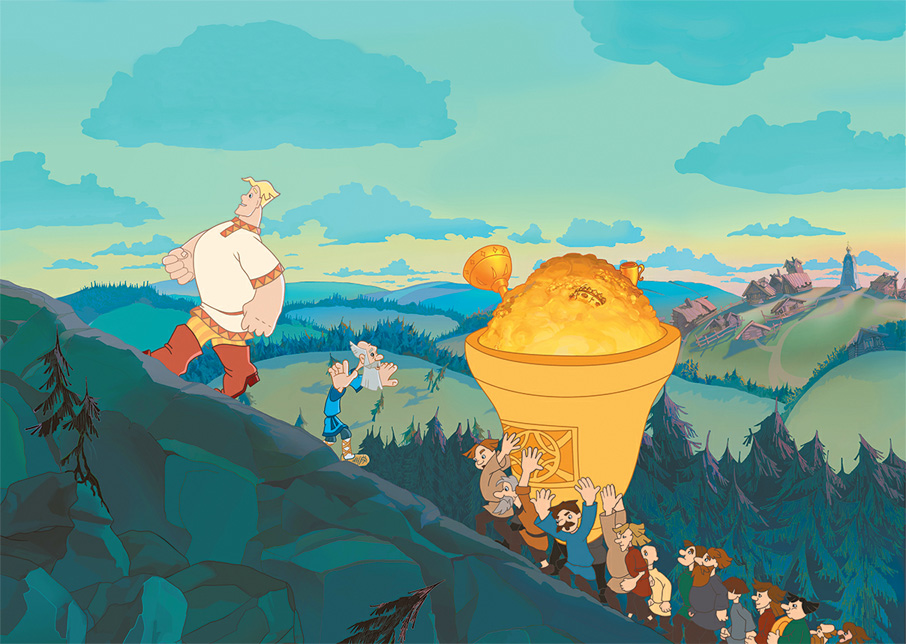 Золото погрузили в огромный колокол и дружно понесли всем городом к пещере. Когда сокровища оказались в пещере, Алёша приволок на гору камень, чтобы завалить им вход в пещеру, когда враги войдут туда.
