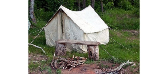Я жил в палатке, где в задней ее половине по всей ширине были построены единые нары-настил из жердей. В передней части сбоку стояла печка с выводом труб дымохода вверх.