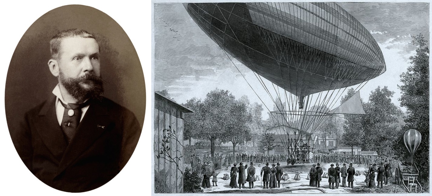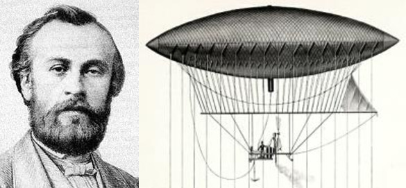 Изобретатель Батист Жюль Анри Жак Жиффар (8 февраля 1825 – 1882 годы, Париж) и его первый дирижабль.