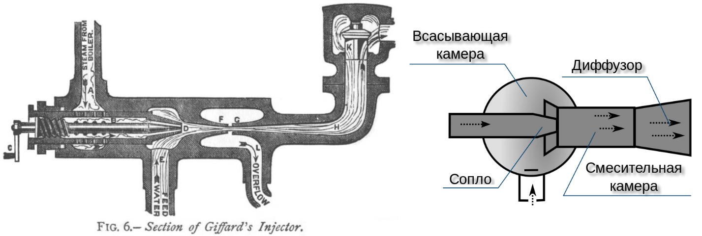 Заправлялся аэростат светильным газом4, дешевым, так как широко нашедшим своё распространение в освещении парижских улиц, но горючим и взрывчатым, вследствие чего дымовая труба была направлена вниз, а топка тщательно экранирована, во избежание малейшей искры. Но как получить тягу в трубе, направленной вниз? Изобретатель нашел выход! Использование парового инжектора5 решало вопрос, но по официальной информации он был изобретен в 1858 году, а значит и первый дирижабль 27-летнего Жиффара и второй, когда французу исполнилось 30 лет, взлетали без него?Но как? Еще одно изобретение талантливого француза – эжектор.Представляет собой устройство, в котором происходит передача кинетической энергии от одной среды, движущейся с большей скоростью, к другой. Эжектор, работая по закону Бернулли, создаёт в сужающемся сечении пониженное давление одной среды, что вызывает подсос в поток другой среды, которая затем уносится и удаляется от места всасывания энергией первой среды, и здесь мы с удивлением узнаем, что эжектор это один из видов вакуумных насосов. Что-ж вопросов больше, чем ответов.