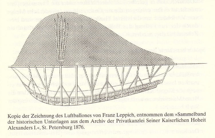 Первая попытка заняться воздухоплаванием в России относиться к войне 12 года или 12 году смерти предыдущего императора Павла I. Германский изобретатель Франц Ксавье Леппих (1778 – 1819), получивший образование в школе монахов-августинцев29, предложил через посла Давида Максимовича Алопеуса Александру I идею управляемого аэростата, который с воздуха может бомбардировать вражеские эскадроны:«Леппих обещал мне построить пятьдесят таких воздушных кораблей в течение трех месяцев… По сделанным доселе расчислениям, наиудобнейшие воздушные корабли могут вмещать в себе 40 человек и поднимать 12000 фунтов веса. В числе артиллерийских предметов, коими он хочет снабдить себя, ожидает он особливо большого действия от ящиков, наполненных порохом, которые, брошены будучи сверху, могут разрывом своим, упав на твердые тела, опрокинуть целые эскадроны».