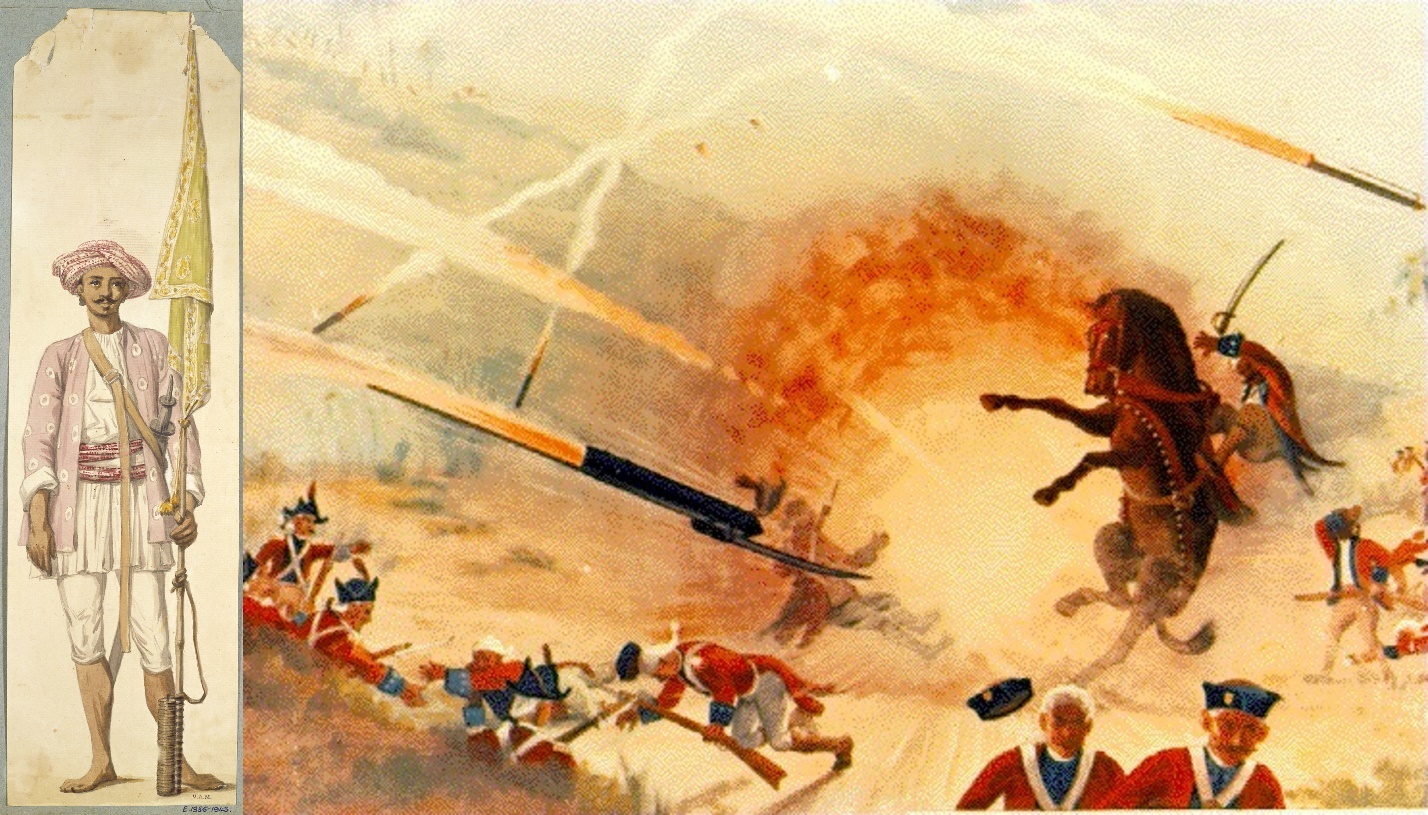 Майсурский солдат, использующий свою ракету в качестве флагштока (Роберт Хоум, 1793/4) и картина, изображающая британские войска, столкнувшиеся с майсурскими ракетами.