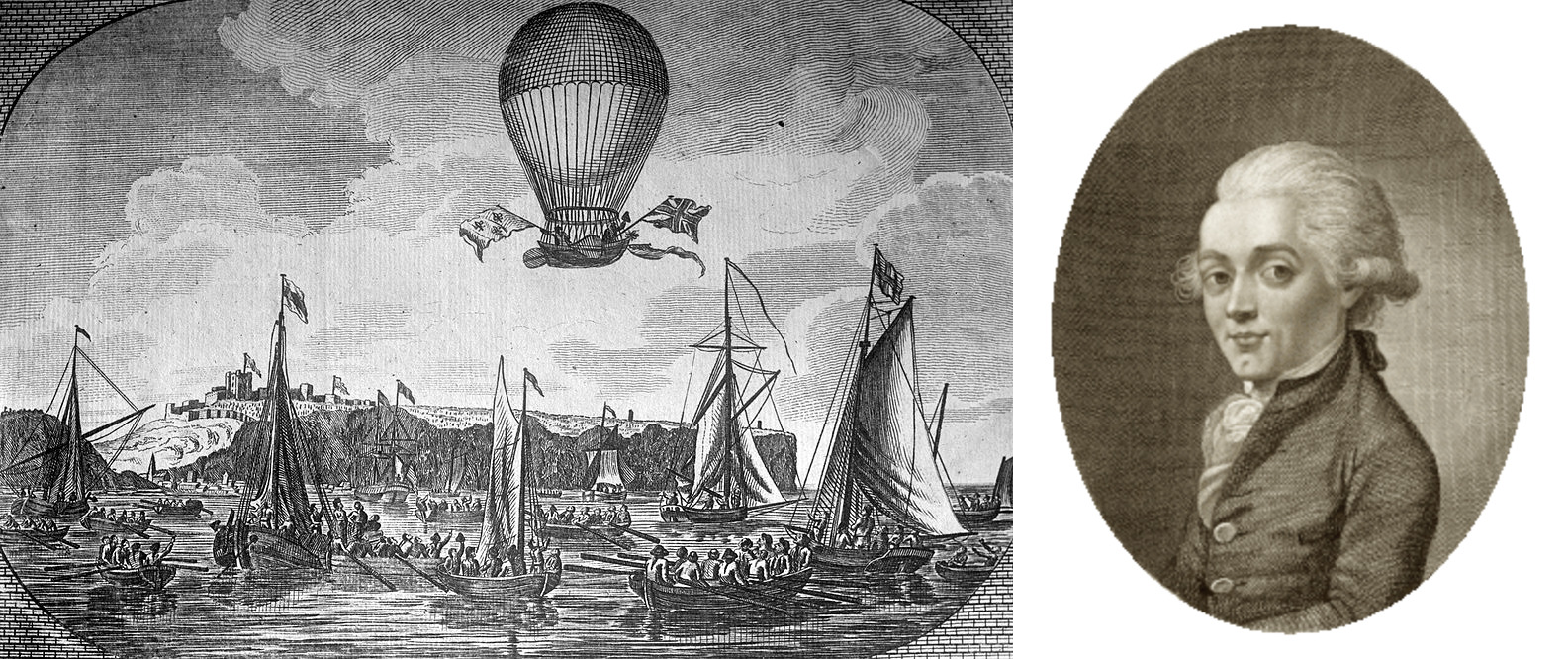Перелёт Бланшара через Ла-Манш в 1785 году и изображение самого авиатора.