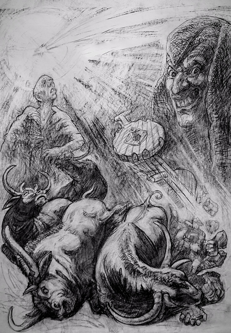 Нашли мы в ту же ночь самую крепкую повозку и шестерых быков хаананьских, в нее и запрягли. Ёя знал дорогу, и, связав потуже, повезли камень прочь. В третий день, когда я спал, утомленный трудною дорогой, быки взревели, как будто к их телам приложили раскаленное клеймо, и с крутого склона завалились вниз. И так своими тушами оставшихся возничих задавили. А каменный отец мой рухнул с ними вниз и раскололся на осколки.