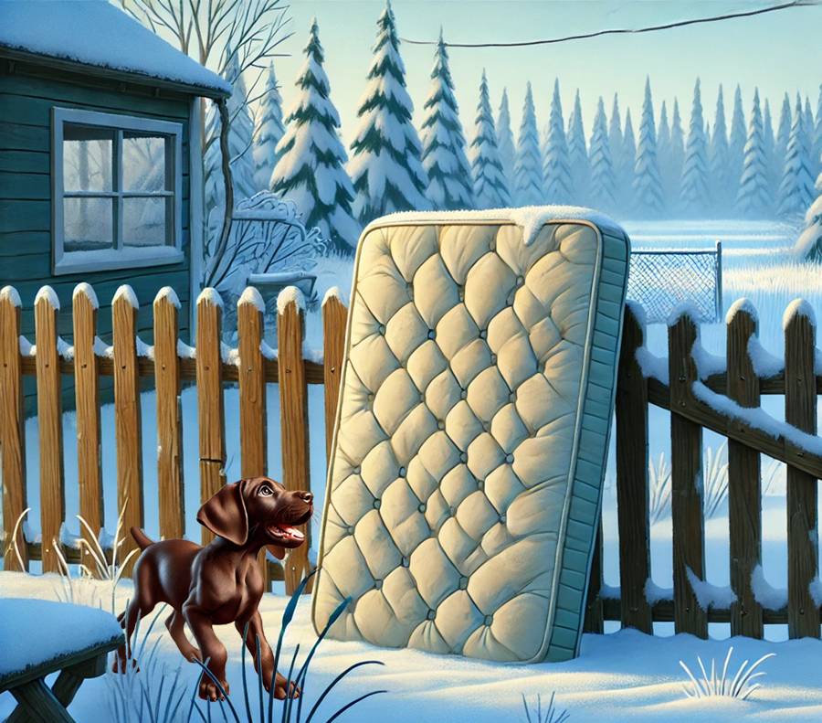 И тут на глаза ему попалась перина, которую старик Митяй вынес на мороз, чтобы истребить всяких в ней жильцов. Снап три раза обошёл вокруг неё – щенку так хотелось потянуть за краешек перины. Хотя бы слегка. Ну, просто хотя бы прикусить. Снап даже заскулил от непреодолимого желания потаскать перину. Он знал, что выхватит от хозяина, но так хотелось! Так хотелось!