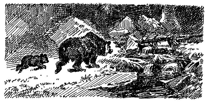 Ручей, вдоль которого шел Тэр, был притоком Бэбин и брал свое начало неподалеку от Скины. Идя к его истокам, гризли забирался все выше. Местность становилась суровой и дикой. Когда ему на пути попался черный медвежонок Мусква, Тэр успел уйти уже миль на семь-восемь от верхней гряды Великого Водораздела.