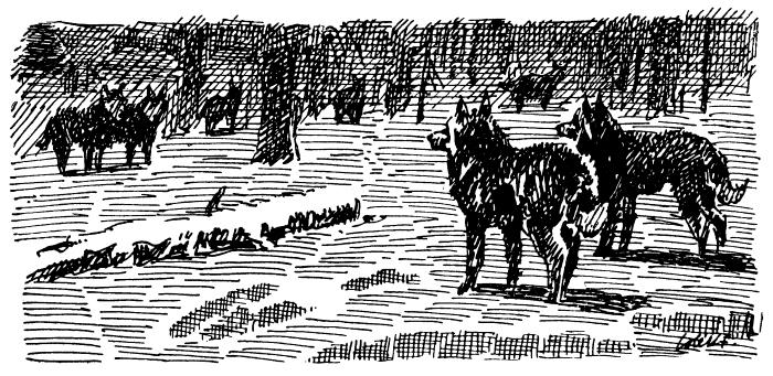 Серая Волчица зарычала. Взглянув на нее, Казан увидел, что она отпрянула назад, угрожающе засверкав клыками и плотно прижав уши. Казан очень удивился. Почему она предупреждает его об опасности? Ведь перед ними волки, а не рысь. И почему волки не начинают пиршества? Казан медленно направился к ним, а Серая Волчица заскулила, прося его вернуться. Но он не обратил на это внимания и продолжал, легко ступая, двигаться вперед, ощетинившись и высоко вскинув голову.