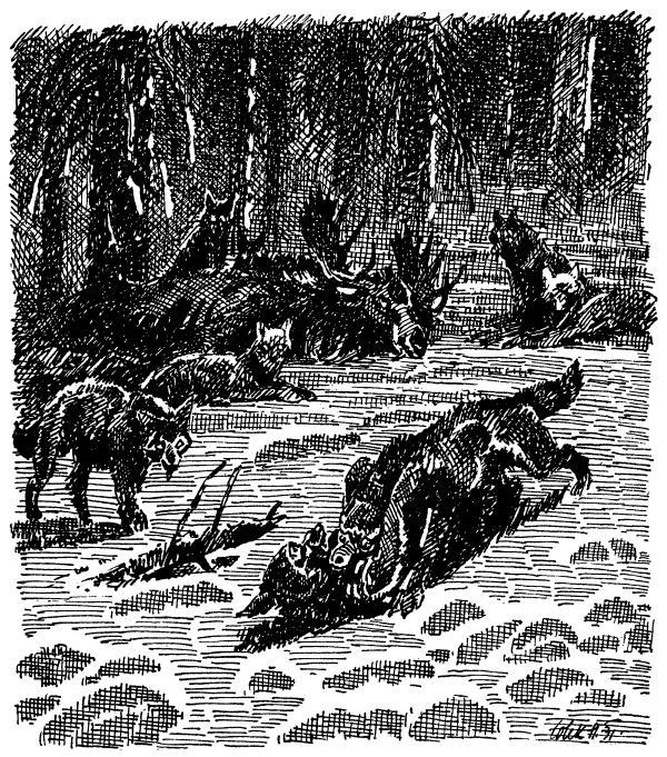 Но внезапно положение переменилось. Послышался протяжный свирепый вой, голос подлинного хозяина дикого леса – волка. От такого голодного воя у людей кровь стынет в жилах, лоси и олени, дрожа от страха, вскакивают на ноги. Этот клич, как песня смерти, летел над лесами и болотами, над покрытыми снегом холмами, и отголоски его в эту звездную ночь были слышны на мили вокруг.